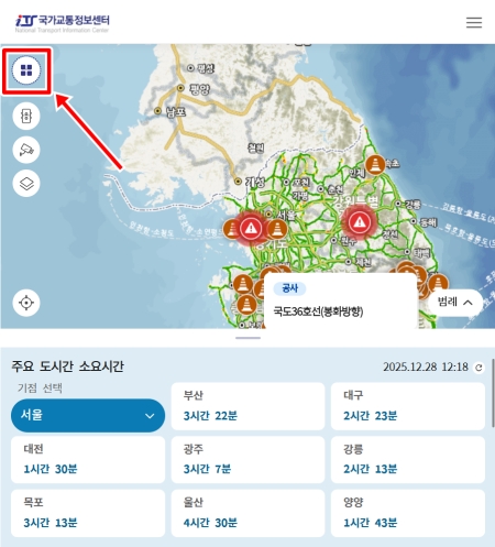 1. 홈페이지 지도 화면 왼쪽 위에 있는 네 개의 사각형으로 이루어진 메뉴를 선택하면 다양한 교통 정보를 볼 수 있는 창이 나타납니다. 여기서 원하는 정보를 찾아볼 수 있어요.