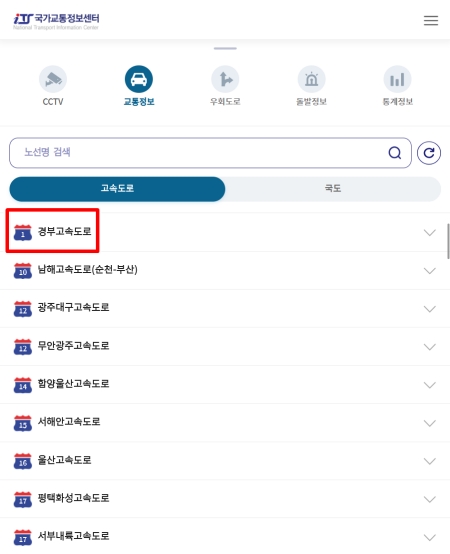 2. 여러 정보 항목 중 '교통정보'를 누르고 '고속도로'를 고르면 우리나라의 모든 고속도로 목록이 나옵니다. 이 목록에서 '경부고속도로' 항목을 찾아 선택해 주세요.