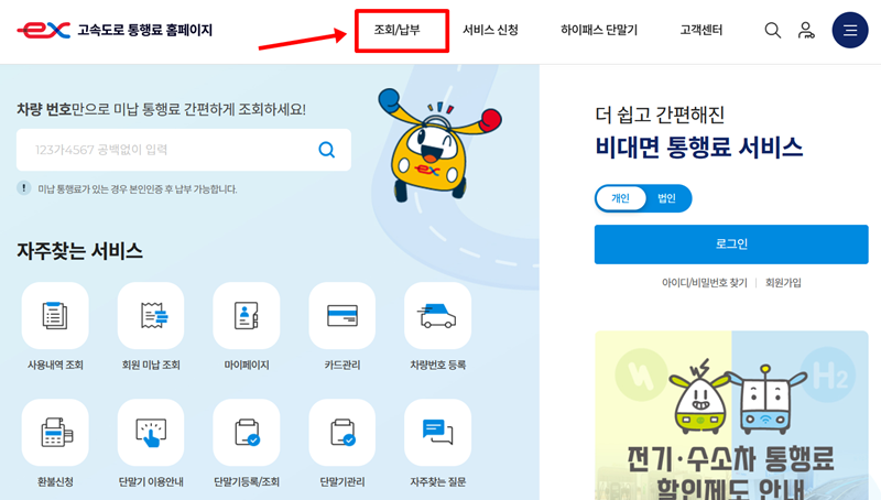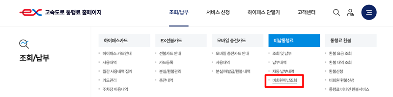 5. '조회/납부' 페이지로 이동하면 하이패스카드, 미납통행료 등 다양한 조회 항목이 있습니다. 로그인을 하지 않고 간편하게 확인하고 싶다면 '미납통행료' 섹션의 '비회원 미납조회'를 선택하세요.