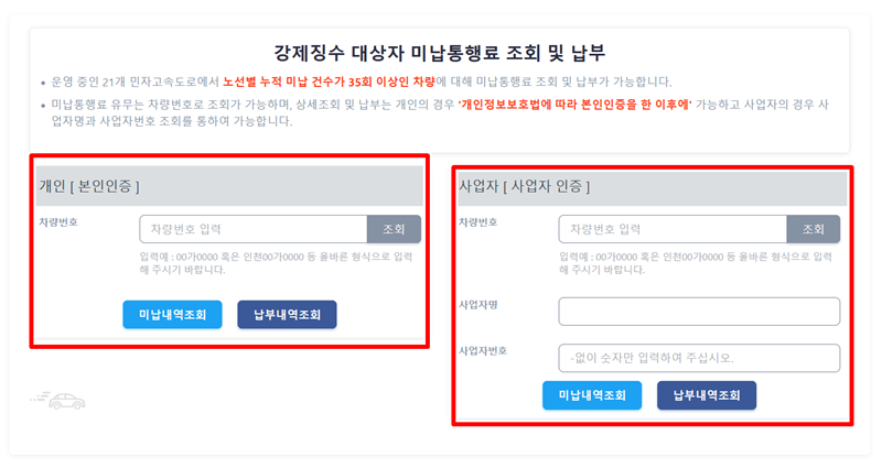3. 미납 통행료 조회 페이지에서는 개인 또는 사업자 여부에 따라 본인 인증 후 조회가 가능해요. 개인의 경우 차량번호를 입력하고, 사업자의 경우 차량번호와 사업자번호를 입력하여 미납 내역과 납부 내역을 확인할 수 있습니다.