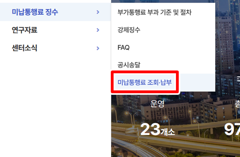 2. '미납통행료 징수'를 누르면 아래로 작은 메뉴들이 나타나는데, 가장 마지막에 있는 '미납통행료 조회·납부'를 선택하여 다음 페이지로 이동하면 됩니다.