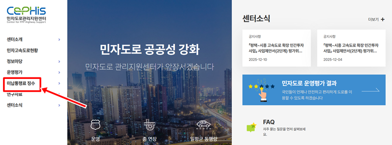 1. 민자도로관리위원회 홈페이지에 접속하면 왼쪽에 여러 메뉴가 보입니다. 그중에서 '미납통행료 징수'라는 항목을 찾아 선택해 주세요. 이곳에서 미납 요금과 관련된 업무를 처리할 수 있습니다.