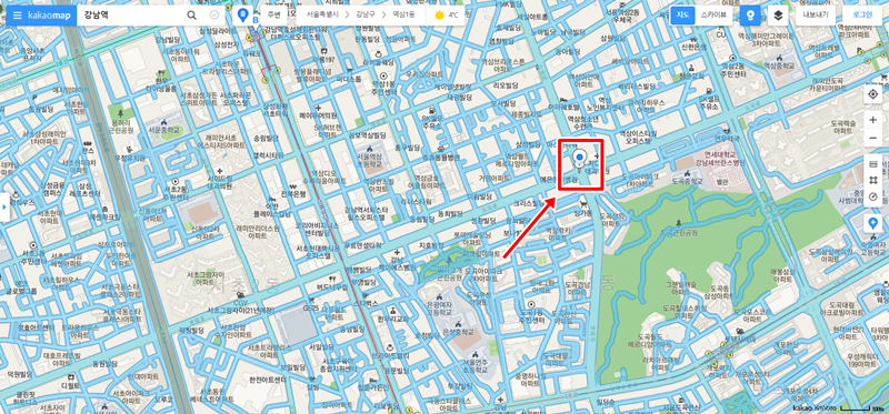 1. 카카오맵 홈페이지에 접속한 뒤, 왼쪽 상단에 있는 검색창에 원하는 장소나 주소를 입력하여 검색합니다. 저는 예시로 '강남역'을 검색해 보겠습니다.