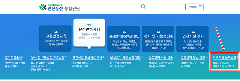 2. '운전면허시험'을 선택하면 아래로 관련 메뉴들이 펼쳐집니다. 가장 오른쪽 아래에 있는 '학과시험 문제은행'을 찾아 들어가면 시험 자료를 받을 수 있는 게시판으로 이동합니다.