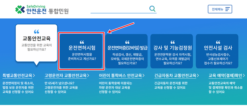1. 안전운전 통합민원 홈페이지에 접속하면 중앙에 여러 메뉴가 보입니다. 그중 운전면허 시험 준비에 필요한 모든 정보가 모여있는 '운전면허시험' 항목을 선택해 주세요.