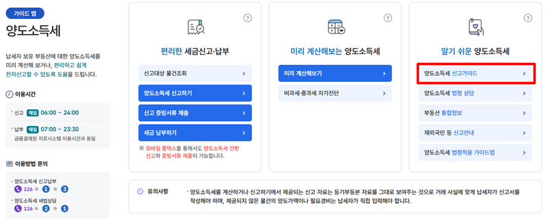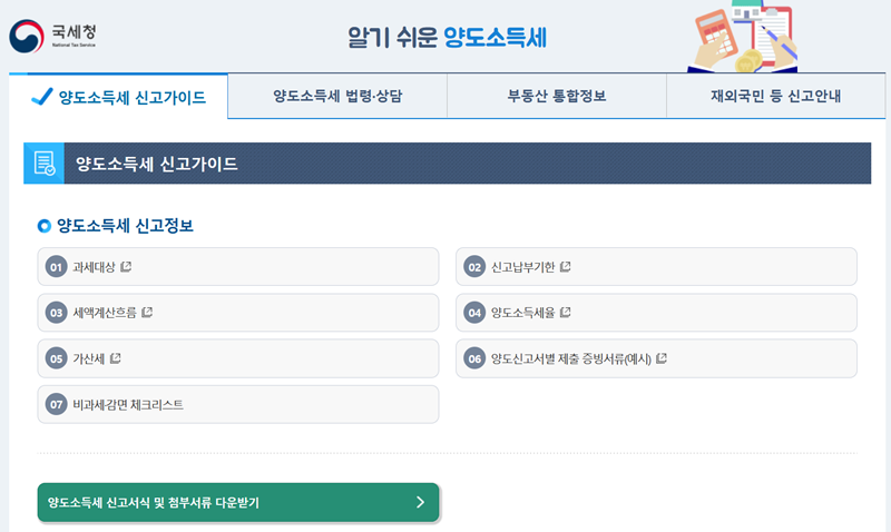 7. 만약 세금 계산뿐만 아니라 신고 절차나 준비 서류 등 더 자세한 정보가 필요하다면, 홈택스 양도소득세 메뉴에 있는 '알기 쉬운 양도소득세'의 '양도소득세 신고가이드'를 참고하면 도움이 됩니다.