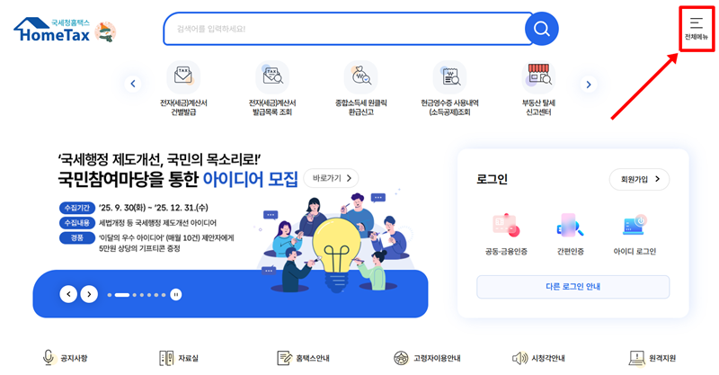 1. 접속한 후, 오른쪽 상단에 있는 전체메뉴를 눌러주세요. 홈택스에서 제공하는 양도세 계산을 포함한 모든 서비스 목록을 한눈에 볼 수 있는 화면으로 이동합니다.