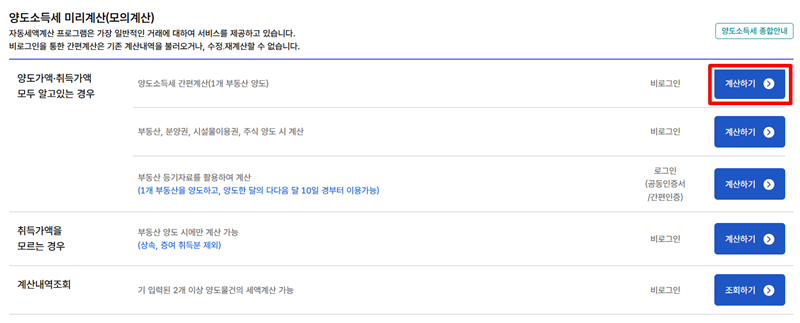 3. 양도소득세 미리계산(모의계산) 페이지로 이동하면 여러 계산 항목이 나옵니다. 가장 일반적인 경우인 '양도가액과 취득가액을 모두 아는 경우'의 첫 번째 항목 오른쪽에 있는 '계산하기'를 눌러주세요. 별도의 로그인 없이도 이용할 수 있습니다.