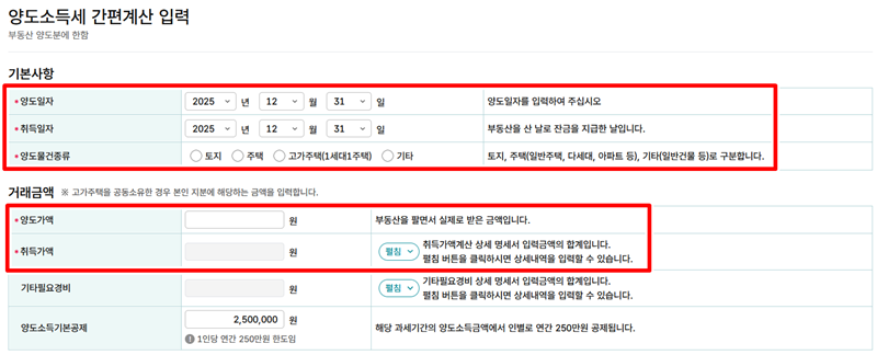 4. 이제 본격적인 계산을 위해 기본 정보를 입력해야 합니다. 부동산을 판 날짜인 '양도일자'와 산 날짜인 '취득일자'를 입력하고, '양도물건종류'를 선택한 뒤, '양도가액'과 '취득가액'을 정확하게 기입해 주세요.