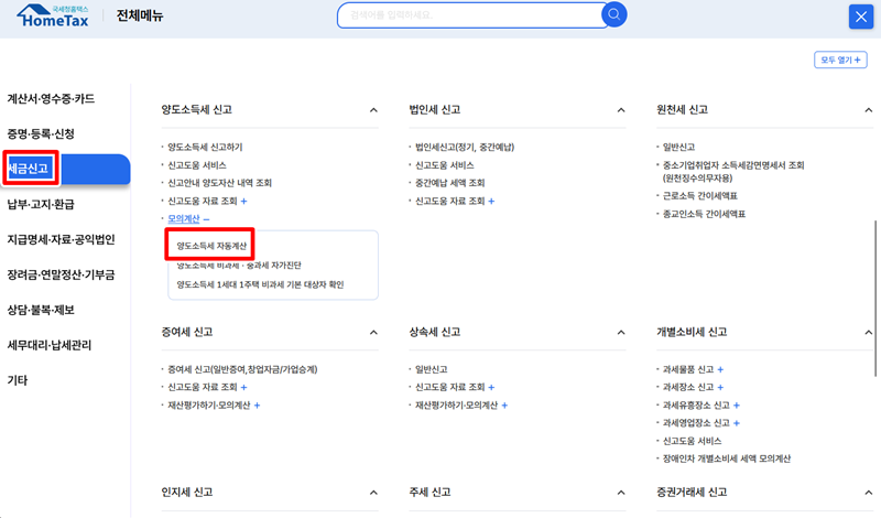 2. 전체메뉴 화면에서 '신고/납부' 카테고리를 찾아주세요. 그 아래에 있는 여러 세금 항목 중에서 '양도소득세'를 선택하면, '양도소득세 자동계산'이라는 메뉴를 발견할 수 있습니다.