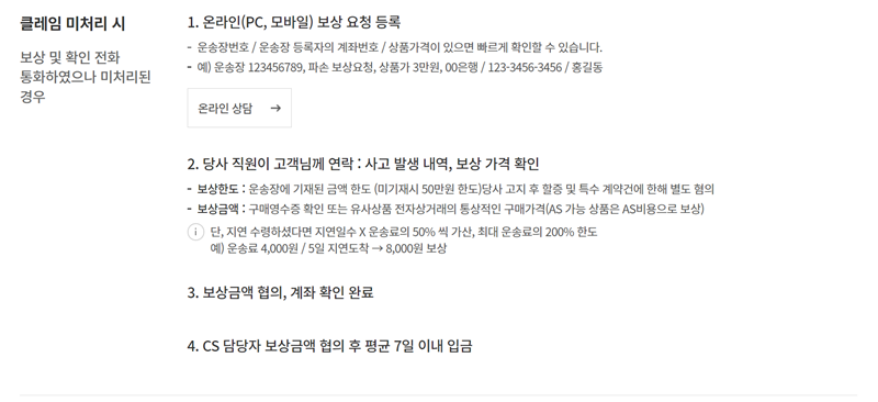 7. 만약 보상 접수 후에도 처리가 원활하게 진행되지 않는다면, 온라인 상담을 통해 문의할 수 있습니다. 운송장 번호와 계좌번호, 상품 가격 등의 정보를 기입하여 등록하면, 담당 직원이 사고 발생 내역과 보상 가격을 확인한 뒤 보상금 협의 및 지급 절차를 진행합니다.