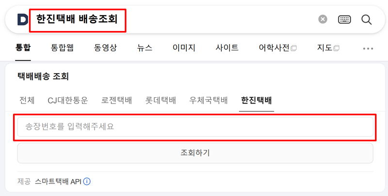 4. 포털 사이트를 이용하면 더욱 간편하게 조회가 가능합니다. 예를 들어 Daum 검색창에 '한진택배 배송조회'라고 입력하면, 별도의 홈페이지 접속 없이 검색 결과 화면에서 바로 운송장 번호를 입력하고 배송 현황을 확인할 수 있는 창이 나타납니다.