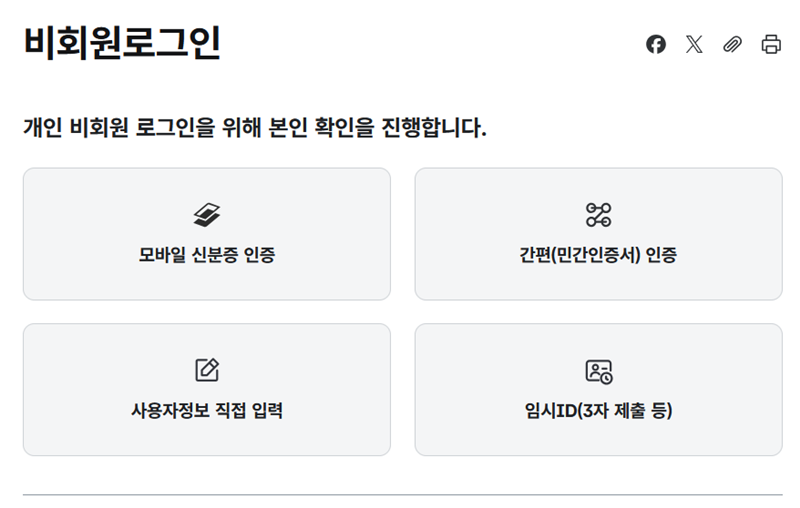 4. 비회원으로 진행할 경우에도 본인 확인은 필요합니다. 모바일 신분증이나 간편인증 등 여러 가지 방법 중에서 자신이 편하게 이용할 수 있는 수단을 선택하여 본인 확인을 마치면 됩니다.