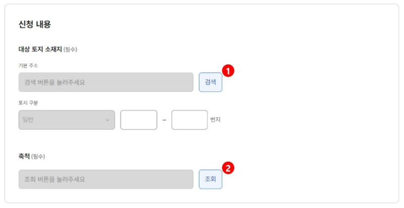 5. 신청 내용을 기입하는 화면에서는 대상 토지의 소재지를 정확하게 넣고, 원하는 축척을 조회하여 선택해야 합니다. 모든 정보는 필수적으로 기입해야 다음 단계로 넘어갈 수 있습니다.