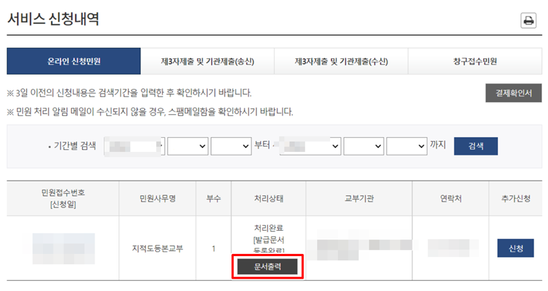 7. 모든 신청 절차가 완료되면 서비스 신청내역에서 처리 상태를 확인할 수 있습니다. 처리가 완료된 후 '문서출력'을 통해 신청한 지적도 등본을 직접 인쇄하여 확인할 수 있습니다.