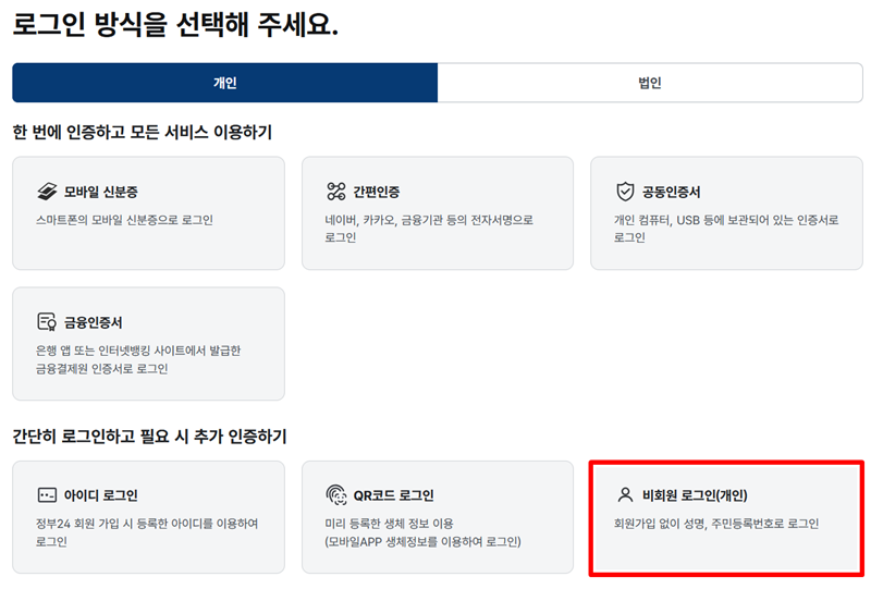 3. 민원 신청을 위해서는 로그인이 필요합니다. 여러 가지 로그인 방식이 있지만, 별도의 가입 절차 없이 이름과 주민등록번호만으로 이용할 수 있는 '비회원 로그인'을 활용하면 간편합니다.