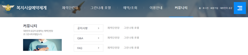 처음 홈페이지에 접속하면 '어디부터 봐야 하지?' 하고 조금 헷갈릴 수 있는데요. 저도 그랬어요. 인터넷 검색창에 '공군 복지시설 예약체계'를 입력해서 들어가 보니, 맨 위에 '체력단련장'부터 '커뮤니티'까지 메뉴들이 깔끔하게 정리되어 있더라고요. 여기서 제가 필요한 걸 찾아서 들어가면 되는 구조라 금방 적응할 수 있었어요. 군인 가족들이 편리하게 쓸 수 있도록 잘 만들어 둔 것 같아요.