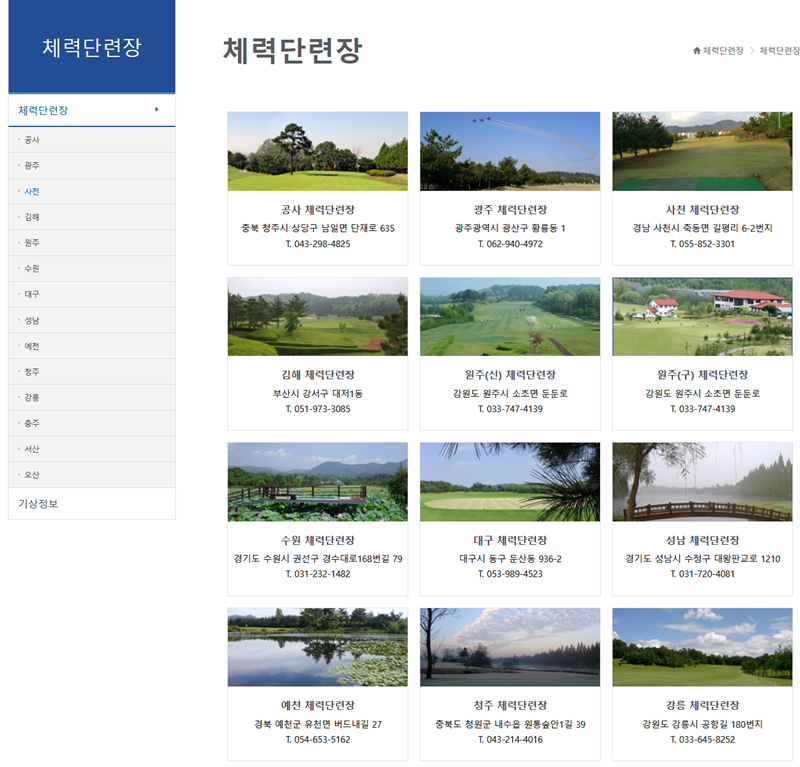 저는 글만 보는 것보다 사진으로 직접 보는 걸 좋아해서, '체력단련장' 메뉴를 눌러봤어요. 그랬더니 전국에 있는 시설들 사진이 쭉 나오면서 주소랑 연락처까지 보기 좋게 정리되어 있더라고요. 사진으로 미리 시설이 어떻게 생겼는지 볼 수 있으니까 어디로 갈지 결정하는 데 큰 도움이 됐어요.