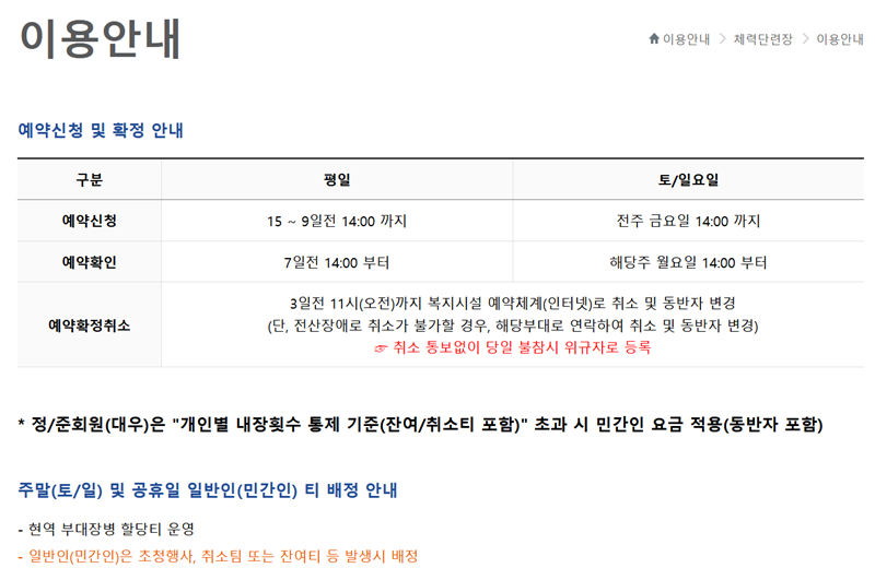 예약할 때 가장 중요한 게 바로 날짜를 맞추는 거잖아요. 저도 혹시나 놓칠까 봐 걱정했는데, '이용안내'에 들어가 보니 예약 신청 기간이 표로 깔끔하게 정리되어 있었어요. 평일이랑 주말 예약 날짜가 언제부터 언제까지인지, 확정 확인은 언제부터 할 수 있는지 정확하게 나와 있어서 계획 세우기가 한결 수월했어요. 예를 들어 평일은 15일 전부터 신청할 수 있더라고요.
