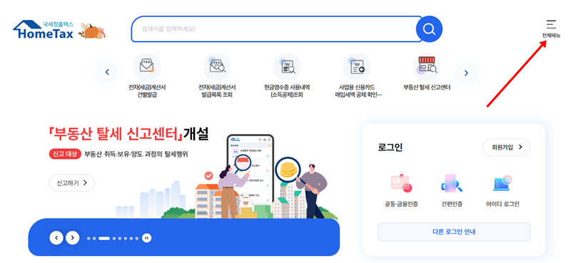 1. 세금 내역을 확인하기 위해서는 먼저 국세청에서 운영하는 사이트에 접속해야 합니다. 메인 화면에 들어오면 수많은 아이콘과 메뉴들이 보이는데, 당황하지 말고 화면 상단이나 우측에 있는 전체 메뉴를 열 수 있는 아이콘을 찾아 선택해주면 모든 기능을 한눈에 볼 수 있는 창이 열립니다.