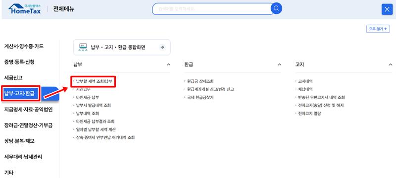2. 전체 메뉴가 펼쳐지면 세금과 관련된 다양한 업무 카테고리가 나타납니다. 여기서 납부나 고지, 환급과 관련된 항목을 찾은 뒤, 내가 현재 납부해야 할 세액을 조회하고 바로 납부까지 할 수 있는 상세 메뉴를 선택하여 다음 단계로 이동합니다.