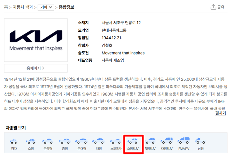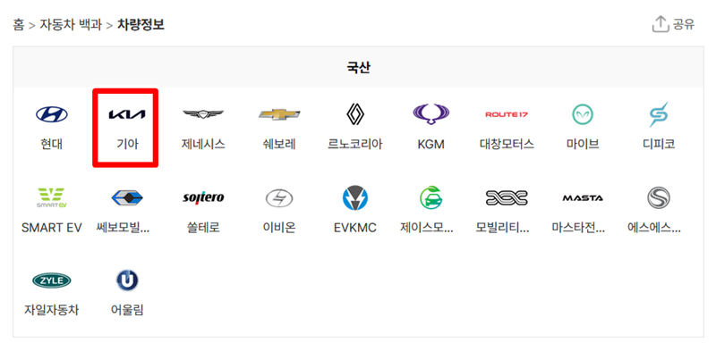 '자동차백과'로 들어가니 국내외 여러 자동차 제조사 로고들이 보였어요. 저는 기아자동차가 궁금했기 때문에 여러 로고 중에서 익숙한 '기아'를 선택했습니다. 국산차 항목에 현대, 제네시스 등과 나란히 있어서 쉽게 찾을 수 있었어요.