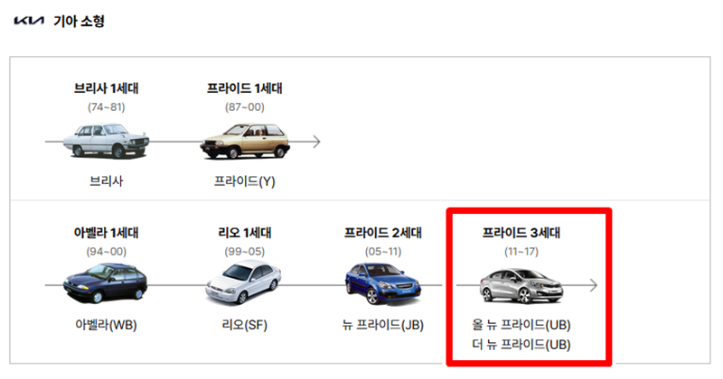 SUV 외에 다른 소형차 정보도 같은 방식으로 찾아볼 수 있었어요. 예를 들어, 기아 페이지에서 '소형' 항목을 선택하면 과거의 브리사부터 프라이드, 리오 같은 모델들의 계보를 확인할 수 있습니다. 여기서 '프라이드 3세대'를 선택하면 해당 모델의 정보를 마찬가지로 자세히 볼 수 있더라고요.