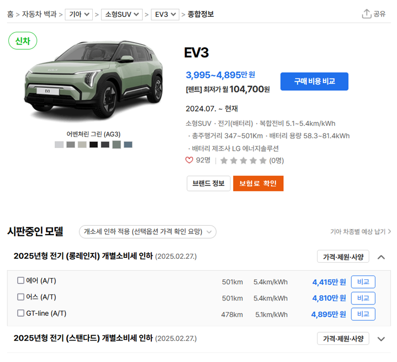 'EV3'를 선택하니 차의 외관 사진과 함께 가격대가 가장 먼저 눈에 들어왔어요. 3,995만 원에서 4,895만 원이라는 구체적인 금액과 함께 어떤 종류의 모델이 있는지 확인할 수 있었죠. 2025년형 롱레인지와 스탠다드 모델의 주행 가능 거리나 배터리 용량 같은 기본 정보도 요약되어 있어서 파악하기 쉬웠습니다.
