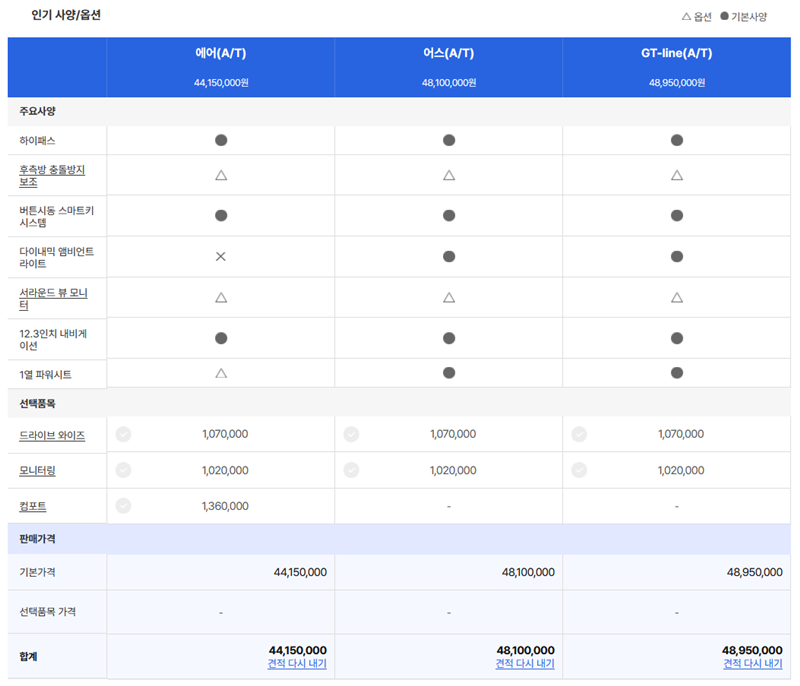 상세 페이지 하단에서는 각 세부 모델별 정확한 가격과 사양을 비교해 볼 수 있었어요. 에어, 어스, GT-라인 모델의 기본 가격이 각각 표시되어 있고, 하이패스나 서라운드 뷰 모니터 같은 주요 사양들이 모델별로 어떻게 다른지 표로 정리되어 있어 한눈에 비교하기 편리했습니다.