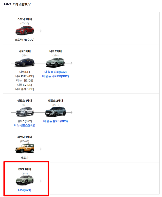 소형SUV 페이지에서는 스토닉부터 셀토스, 니로 등 기아의 소형SUV 모델들의 변천사를 한눈에 볼 수 있었어요. 저는 가장 최신 모델인 'EV3 1세대'가 궁금해서 이 항목을 선택해 더 자세한 정보를 확인해 보기로 마음먹었습니다. 각 모델별로 출시 연도도 표시되어 있어 유용했어요.