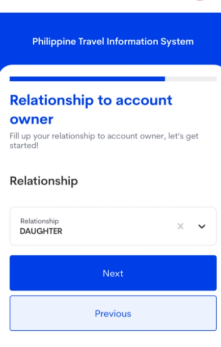 이 화면은 계정 소유주와의 관계를 입력하는 부분으로, 주로 가족 등 다른 사람의 정보를 대신 등록해 줄 때 사용됩니다. 본인의 여행 정보를 직접 입력하는 과정에서는 이미 본인으로 등록했기 때문에 이 단계가 나타나지 않거나, 나타나더라도 간단히 확인하고 다음으로 넘어가면 됩니다.