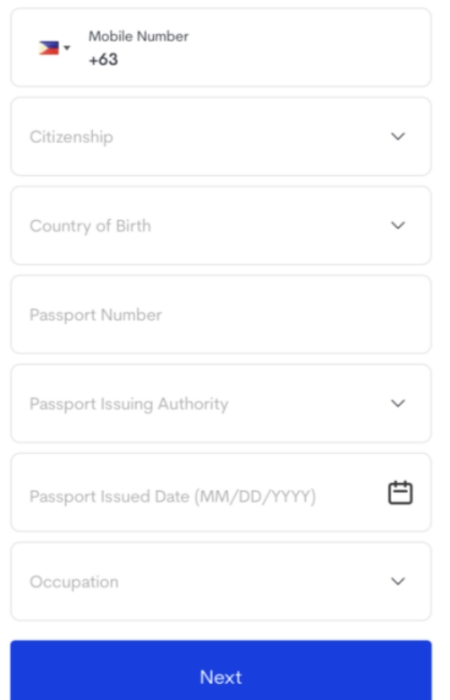 이어서 휴대폰 번호와 국적, 출생 국가, 여권 번호, 여권 발급 기관 등 추가적인 개인 정보를 입력해야 합니다. 모든 정보는 본인의 여권을 옆에 두고 정확하게 확인하면서 기입하는 것이 가장 좋습니다. 각 항목을 빠짐없이 채운 후에 아래에 있는 'Next'를 눌러 다음으로 진행합니다.