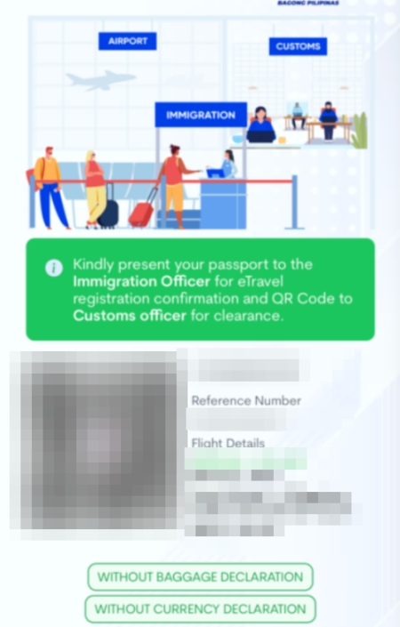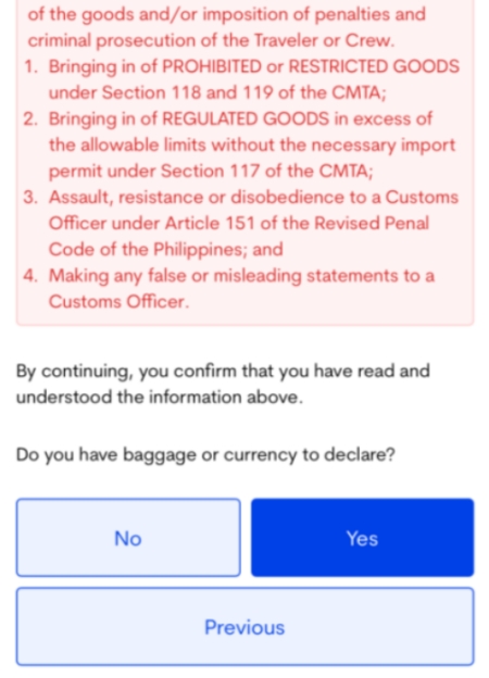 세관 신고 단계로 넘어가기 전, 필리핀의 세관 규정에 대한 안내문을 확인하게 됩니다. 반입이 금지되거나 제한되는 물품, 규정된 한도를 초과하는 물품 등에 대한 내용이니 가볍게 읽어본 후, 아래에 신고할 수하물이나 통화가 있는지 묻는 질문에 'No' 또는 'Yes'로 답변하고 다음으로 진행합니다.