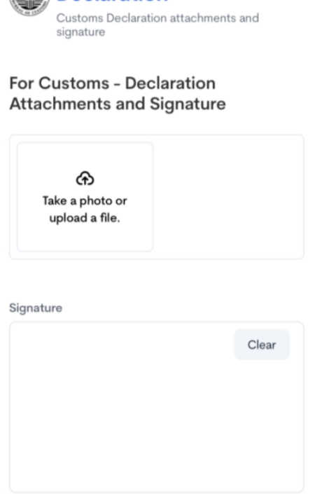 세관 신고를 위해 필요한 첨부 파일이 있거나 서명이 필요한 경우에 사용하는 화면입니다. 특별히 신고할 물품이 없다면 이 단계에서는 별도로 파일을 올리거나 서명을 입력할 필요 없이 다음 단계로 넘어가도 무방합니다.