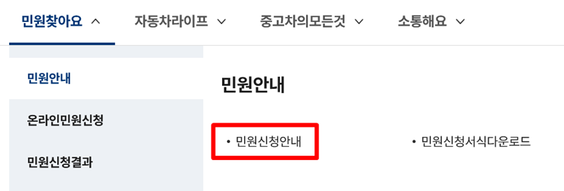 '민원찾아요' 위에 마우스를 올리면 아래로 몇 가지 하위 메뉴가 나타납니다. '민원안내', '온라인민원신청', '민원신청결과' 중에서 가장 처음에 있는 '민원안내'를 선택해 주세요. 그러면 해당 민원에 대한 상세한 안내 페이지로 이동하게 되는데, 여기서 우리가 진행할 절차의 첫걸음을 시작할 수 있습니다.