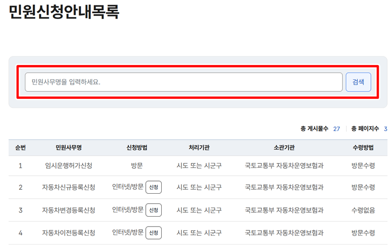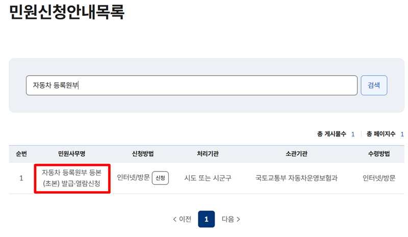 민원신청안내 목록 페이지가 나타나면 수많은 민원 목록 때문에 조금 복잡하게 느껴질 수 있습니다. 하지만 당황하지 않으셔도 괜찮아요. 화면 중앙에 보이는 검색창에 우리가 처리하고자 하는 민원사무의 이름, 즉 '자동차 등록원부'를 직접 입력한 뒤 오른쪽에 있는 '검색'을 눌러주세요.