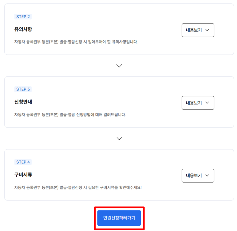 민원안내 화면으로 들어오셨다면, '민원신청안내'와 '민원신청서식다운로드'라는 두 가지 큰 항목을 볼 수 있습니다. 여기서 우리는 신청에 대한 안내를 먼저 확인해야 하므로, 왼쪽에 위치한 '민원신청안내' 부분을 눌러서 다음 단계로 넘어가면 됩니다. 이제 거의 절반 정도 진행한 셈이에요.
