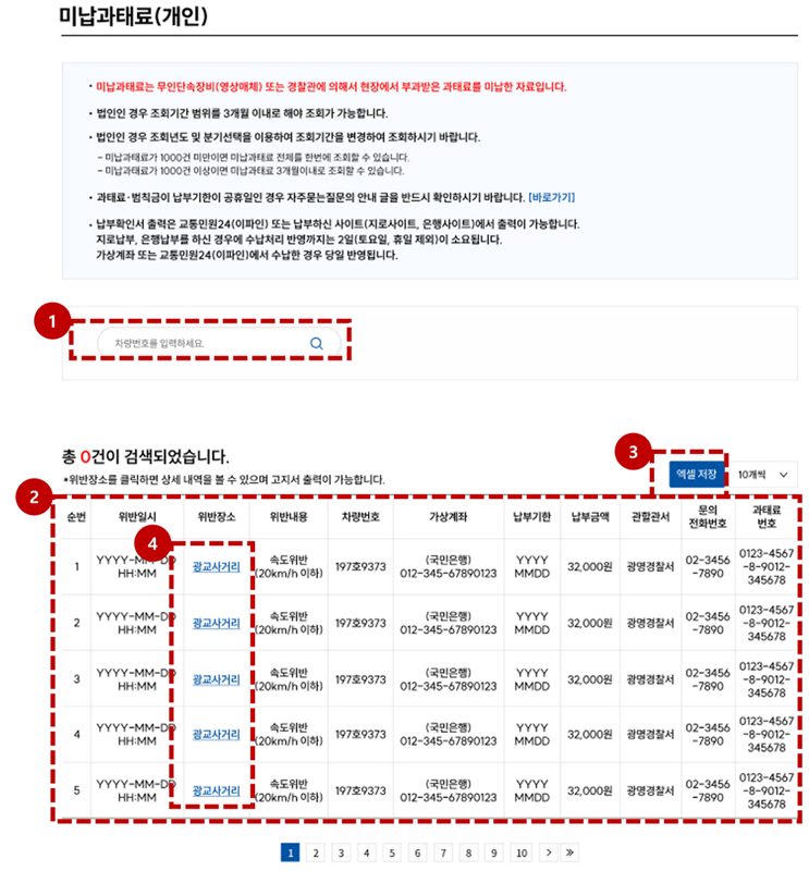 이번에는 '미납과태료' 메뉴를 살펴볼게요. 혹시 잊어버리고 내지 않은 과태료가 있는지 확인하는 곳인데요. 마찬가지로 차량번호를 입력하면 목록이 나타납니다. 여기서 위반 장소와 미납된 금액 등을 확인할 수 있어요. 만약 여러 건이 있다면 목록으로 쭉 정리되어 나오니 꼼꼼하게 살펴보시는 것이 좋습니다.