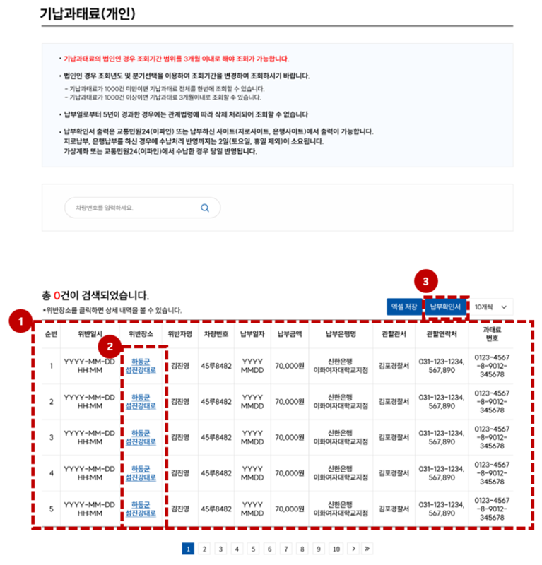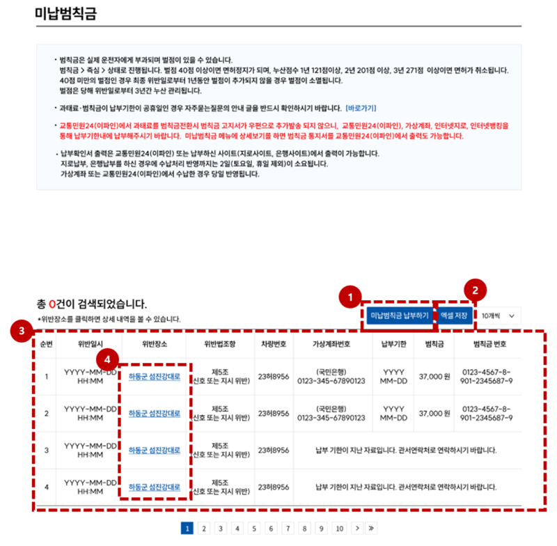 과거에 냈던 내역이 궁금할 때도 있잖아요. 그럴 때는 '기납과태료' 메뉴를 이용하면 됩니다. 이전에 납부했던 과태료 기록들을 모두 찾아볼 수 있는데요. 언제, 어디서 위반했고, 얼마를 냈는지 등의 정보가 순서대로 정리되어 있어서 나의 운전 습관을 되돌아보는 데에도 도움이 되더라고요.