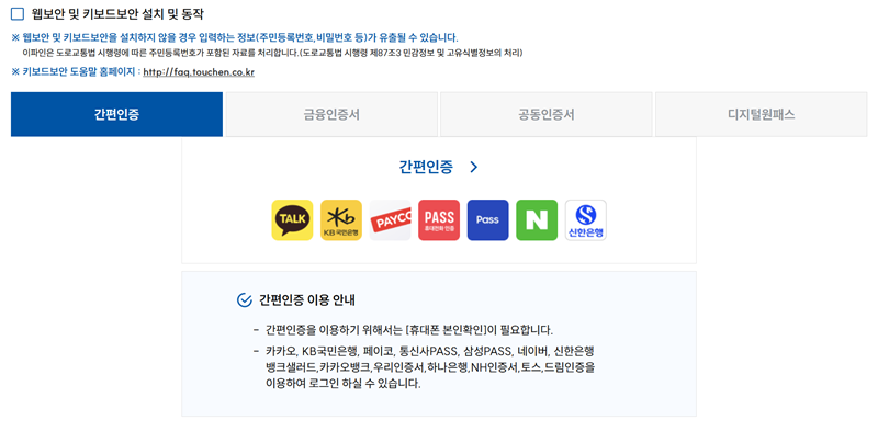 조회를 위해서는 본인 확인 절차가 필요해요. 개인정보가 담겨있다 보니 당연한 과정이겠죠. 여러 인증 방식이 있는데, 저는 그중에서도 카카오톡이나 통신사 패스 앱 등을 이용하는 '간편인증'이 가장 편하더라고요. 물론 공동인증서나 금융인증서 등 다른 편한 방법을 이용하셔도 괜찮습니다.