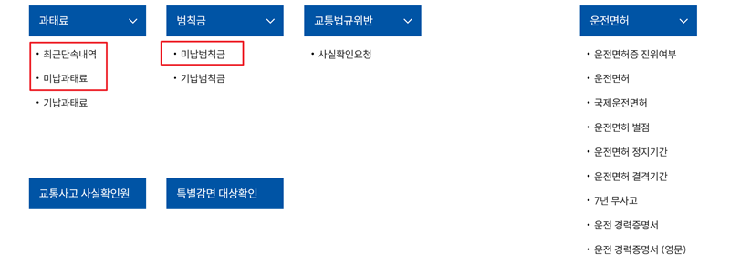 '조회'를 누르면 아래로 다양한 하위 메뉴들이 나타나는데요. 여기서 내가 확인하고 싶은 항목을 고르면 됩니다. 최근 단속된 내역이 궁금하다면 '최근단속내역'을, 아직 내지 않은 과태료나 범칙금이 있는지 알아보려면 각각 '미납과태료'와 '미납범칙금'을 선택해서 들어갈 수 있어요. 필요에 따라 원하는 메뉴를 골라주시면 됩니다.
