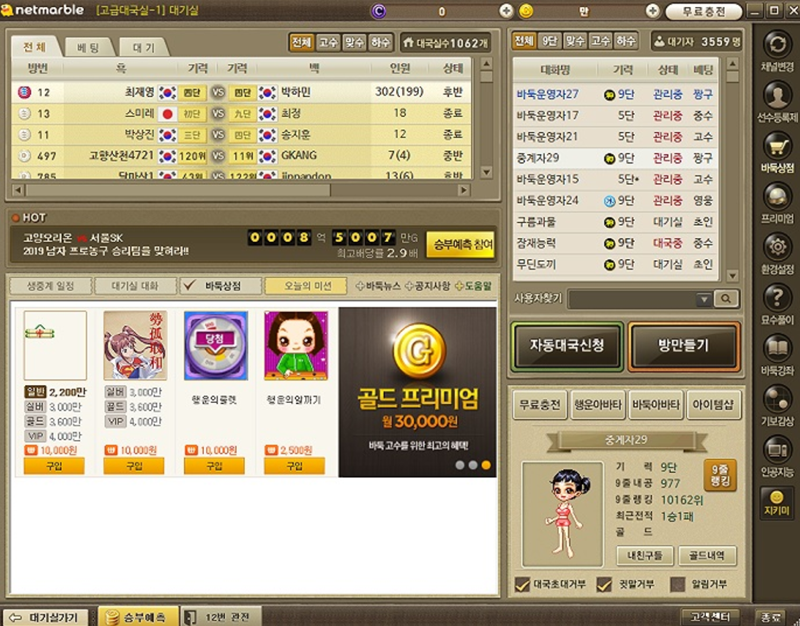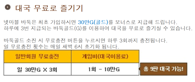 무료 게임이라길래 어떻게 운영되는지 궁금했었는데요, 처음 가입하면 보너스로 30만G(골드)를 지급해 주더라고요. 이 바둑골드를 사용해서 무료로 대국을 즐길 수 있고, 골드를 다 쓰더라도 하루 3번까지 무료 충전이 가능해서 부담 없이 즐길 수 있겠어요.