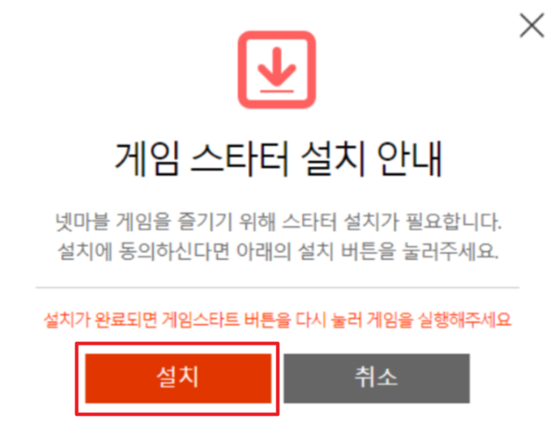 내려받은 파일을 실행하니 '게임 스타터 설치 안내'라는 창이 나타났어요. 넷마블 게임을 즐기기 위해 필요한 프로그램을 먼저 설치해야 한다고 하더라고요. 안내에 따라 아래쪽에 있는 주황색 '설치' 부분을 선택해서 진행했습니다.