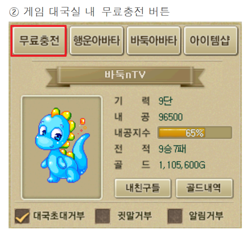 게임 안에서도 골드를 충전할 수 있었어요. 대국실 화면에서 제 캐릭터 정보가 보이는 곳을 보면 '무료충전' 항목이 따로 마련되어 있더라고요. 덕분에 게임의 흐름이 끊기지 않게 바로바로 충전해서 대국을 이어갈 수 있어서 편리해 보였습니다.