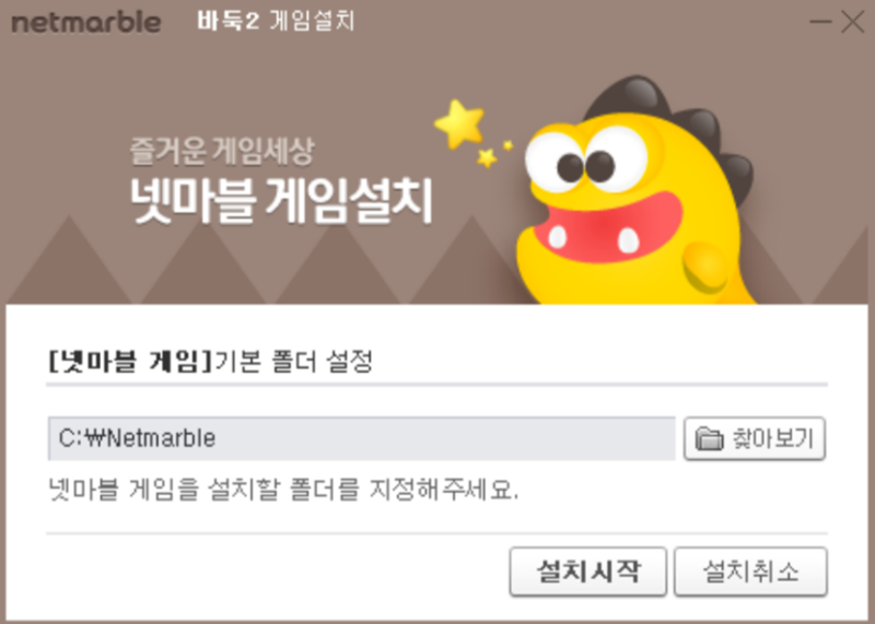 스타터 설치가 끝나자 이어서 본격적인 '넷마블 바둑2 게임설치' 창이 나타났어요. 게임을 어느 폴더에 설치할지 경로를 지정하는 부분이었는데, 저는 기본으로 설정된 경로를 그대로 두고 '설치시작'을 눌러 설치를 계속 진행했어요.