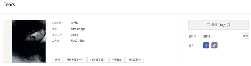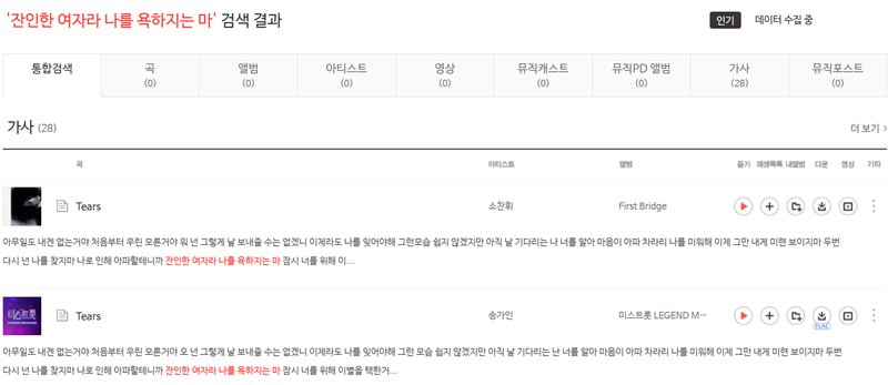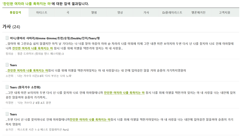 역시나 멜론에서도 검색 결과 화면에 '가사' 카테고리가 따로 있었고, 해당 가사가 포함된 여러 노래를 보여주었습니다. 소찬휘 님의 'Tears'를 비롯해 다른 아티스트들이 부른 버전까지 찾아주어, 원하는 노래를 선택해서 들을 수 있었습니다.