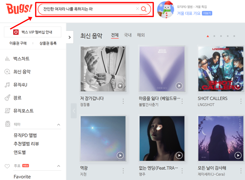 저처럼 아는 가사만 있고 제목을 모를 때 정말 막막하죠. 이럴 땐 벅스 홈페이지에 접속하는 것부터 시작하면 돼요. 저는 먼저 검색을 통해 벅스 홈페이지를 열고, 상단에 있는 검색창에 기억하고 있던 가사를 그대로 입력해 보았습니다.
