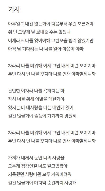 혹시나 동명이곡일 수도 있으니 전체 가사를 확인해보기로 했어요. 상세 정보 화면에서 가사 항목을 살펴보니, 제가 기억하던 구절 외에도 익숙한 다른 가사들이 보였습니다. 덕분에 제가 찾던 노래가 이 노래가 맞다는 것을 최종적으로 확인할 수 있었죠.