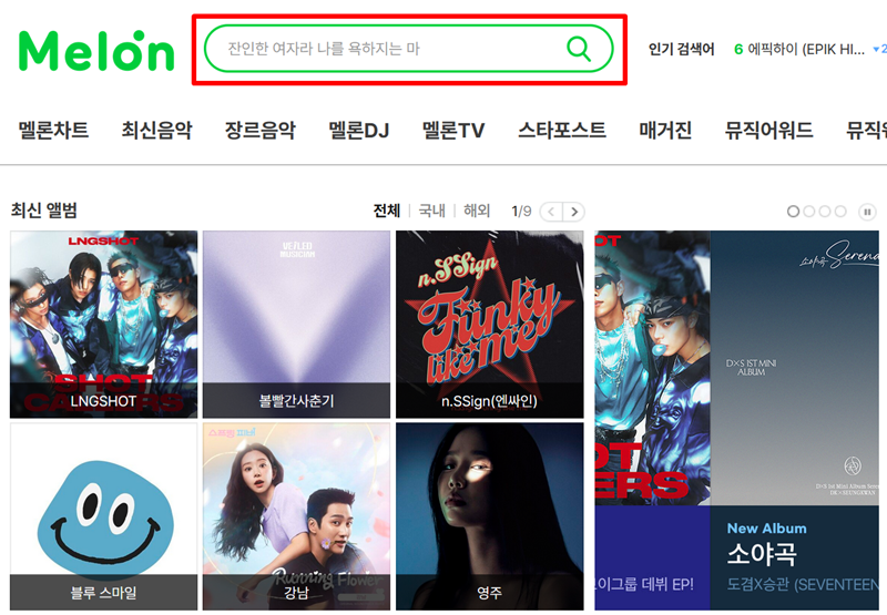 이 방법은 다른 음악 홈페이지에서도 똑같이 활용할 수 있어요. 이번에는 멜론 홈페이지에 접속해서 동일한 방법으로 시도해 보았습니다. 홈페이지 중앙에 있는 검색창에 가사를 입력하고 검색을 진행했어요.