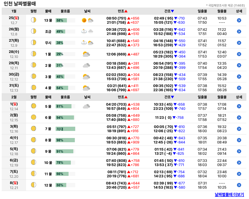 지역을 선택하면 가장 먼저 해당 지역의 상세한 물때표를 확인할 수 있어요. 날짜별로 만조 시간과 간조 시간, 그리고 그때의 해수면 높이까지 아주 자세하게 나와 있답니다. 달의 모양이나 물의 흐름 세기 같은 정보도 함께 볼 수 있어서, 특히 낚시를 계획하는 분들에게는 정말 큰 도움이 될 거예요.
